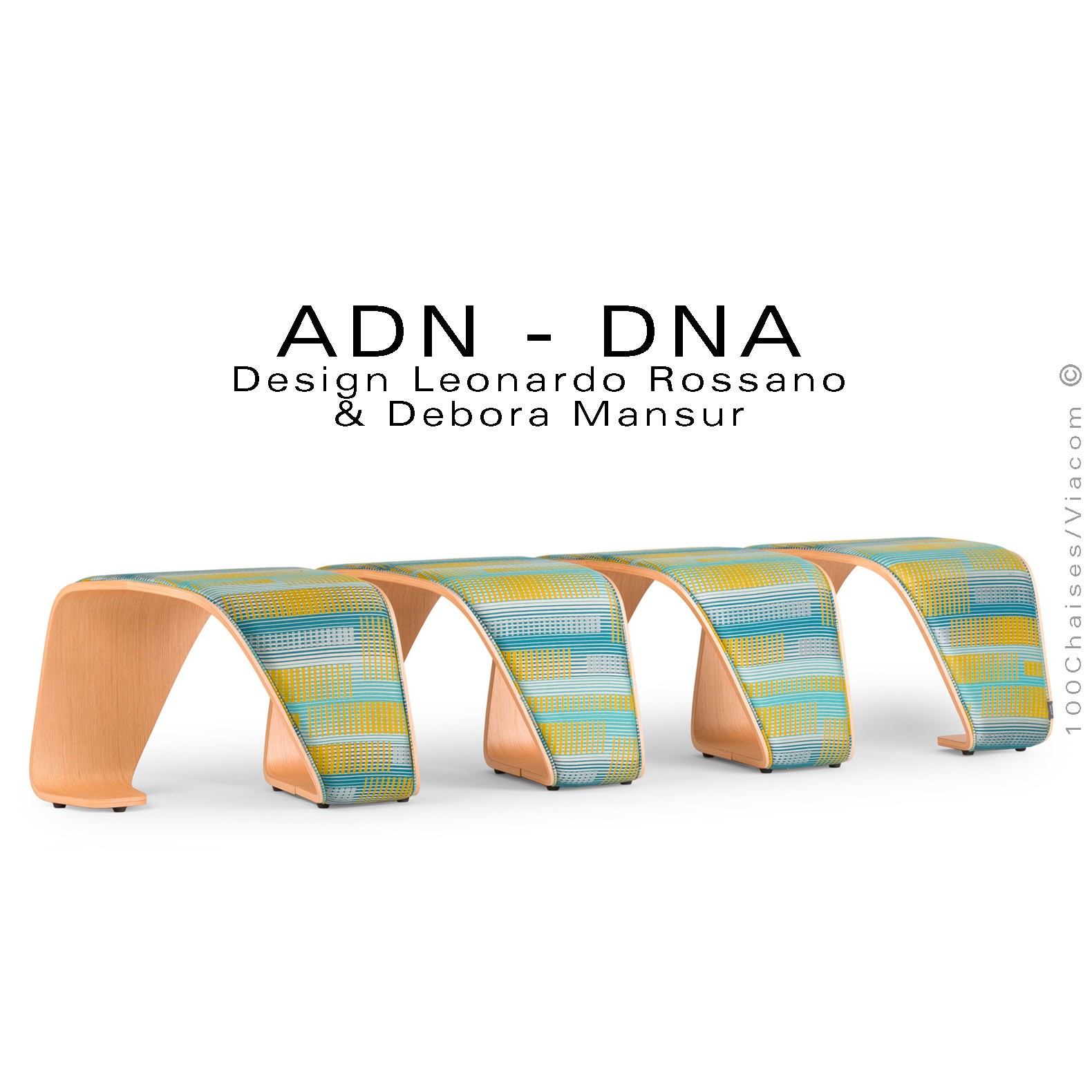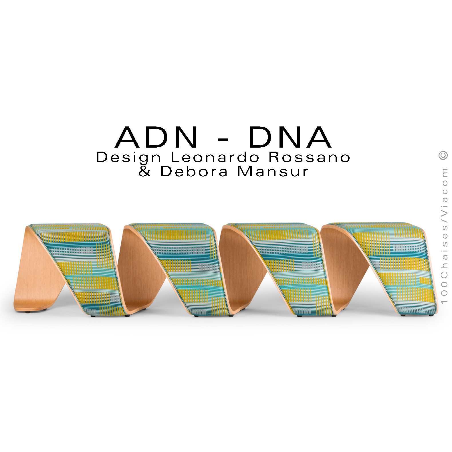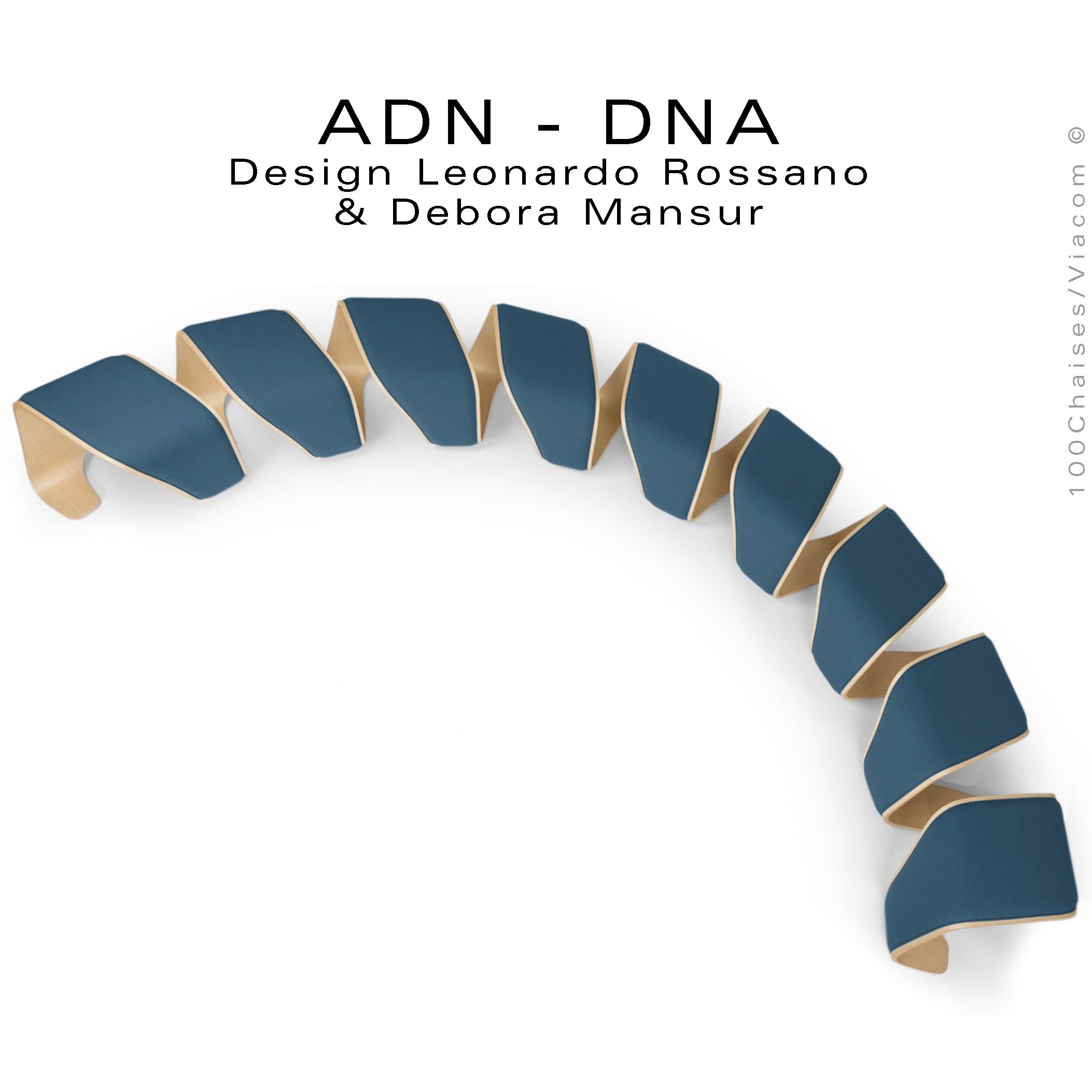 Banc d'attente design ADN aux formes hélicoïdales en multiplis de bois finition tissu tissé 100% polyester.