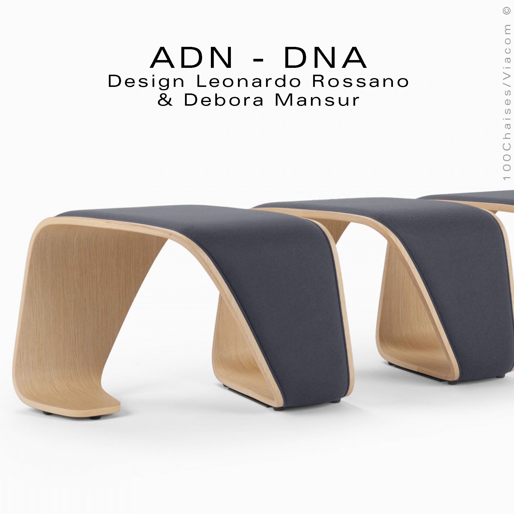 Banc d'attente design ADN, assise 5 places, réalisé en multicouche de bois de hêtre courbé, d'une épaisseur de 18 mm. Avec tampons de protection des sols. Finition assise placage de chêne naturel avec rembourrage de mousse polyuréthane. Habillage tissu tissé gamme Urban du fabricant CAMIRA, 100% polyester.