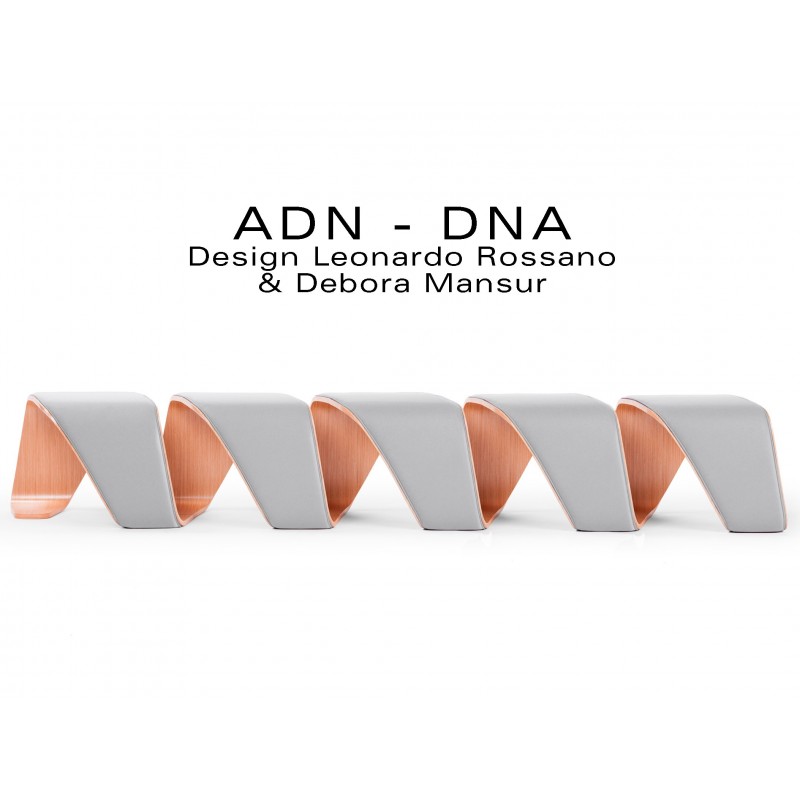 Aménagez un espace d'accueil aussi convivial qu’original grâce au banc modulaire DNA. Inspiré des formes dynamiques de la modélisation moléculaire de deux brins d’ADN, ce banc design se compose d'un seul élément de contreplaqué de bois courbé ou de tôle d'acier. En résulte un meuble atypique avec une forme d’hélice offrant une assise confortable. Robuste, disponibles dans de nombreuses déclinaisons, ce banc trouvera sa place les environnements d'accueil tels que les halls d'entrée ou les salles d’attente en intérieur mais aussi en extérieur pour le modèle acier. La banquette droite peut être réalisée avec un minimum de 3 modules de sièges, jusqu'à 7 places linéaire. Le banc DNA est également disponible dans une version ou l'assise reçoit de la mousse et l'habillage d'un tissu de choix. N’hésitez pas à nous contacter afin de nous faire part de vos projets d’aménagement. Nous pourrons vous conseiller sur les nombreuses configurations offertes par le banc DNA.
