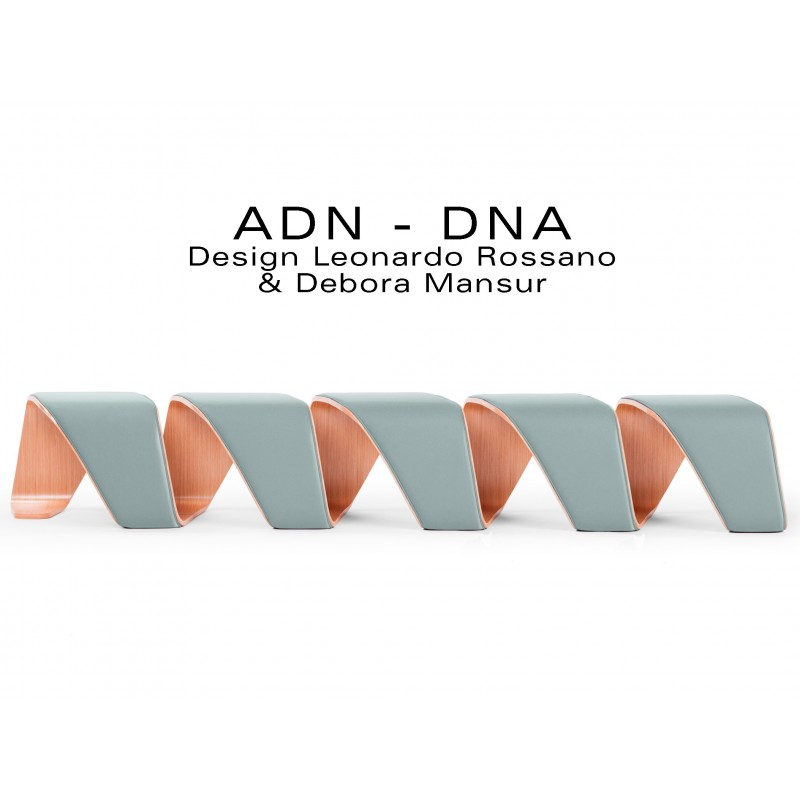 Aménagez un espace d'accueil aussi convivial qu’original grâce au banc modulaire DNA. Inspiré des formes dynamiques de la modélisation moléculaire de deux brins d’ADN, ce banc design se compose d'un seul élément de contreplaqué de bois courbé ou de tôle d'acier. En résulte un meuble atypique avec une forme d’hélice offrant une assise confortable. Robuste, disponibles dans de nombreuses déclinaisons, ce banc trouvera sa place les environnements d'accueil tels que les halls d'entrée ou les salles d’attente en intérieur mais aussi en extérieur pour le modèle acier. La banquette droite peut être réalisée avec un minimum de 3 modules de sièges, jusqu'à 7 places linéaire. Le banc DNA est également disponible dans une version ou l'assise reçoit de la mousse et l'habillage d'un tissu de choix. N’hésitez pas à nous contacter afin de nous faire part de vos projets d’aménagement. Nous pourrons vous conseiller sur les nombreuses configurations offertes par le banc DNA.