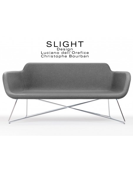 Canapé design pour lieu d'attente SLIGHT, canapé 2 places, structure en contreplaqué 22 mm. d'épaisseur, avec assise et dossier garnis de mousse polyuréthane haute densité. Piétement en acier tubulaire 14 mm. type Eiffel, finition acier chromé avec tampons plastiques de protections des sols. Habillage tissu Blazer du fabricant Camira 100% Laine vierge type feutre - Feu norme AM-18.