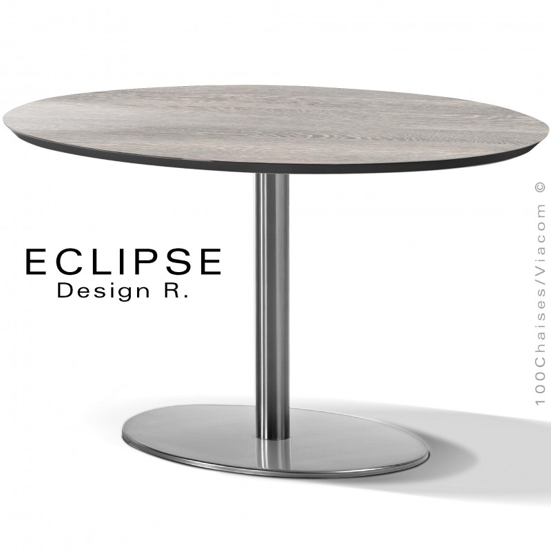 Table ovale ECLIPSE sur pied central inox, plateau stratifié HPL wengé blanc cérusé, chant plateau couleur noir.