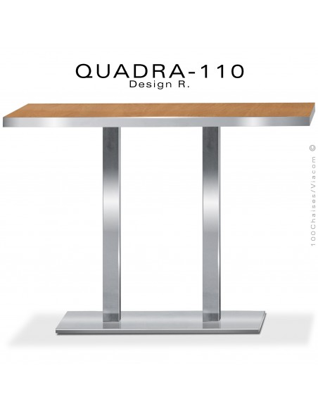 Grande table haute ou mange debout rectangulaire pour repas, snack, café, bistrot, C.H.R., QUADRA, (6 à 8 personnes). Piétement platine de sol rectangulaire 800x400 mm., avec molettes de mise à niveau et tampons plastiques de protection des sols. Double colonne centrale tube d'acier 80x80 mm., finition inox brossé, inox poli et chromé brillant. Plateaux rectangulaire type Agglo. épaisseur 22 mm., avec inserts négatifs afin de simplifier le montage. Finition plateau plaquage stratifié uni, aspect bois ou matière (autre voir palette stratifié). Chant plateau ABS coloris inox brossé, poli ou chromé en accord avec choix piétement, épaisseur 44 mm. (autres épaisseurs 52 ou 57 mm.). Dimensions plateaux : 700x1200 - 800x1200 mm. Livraison piétement monté, plateau démonté.
