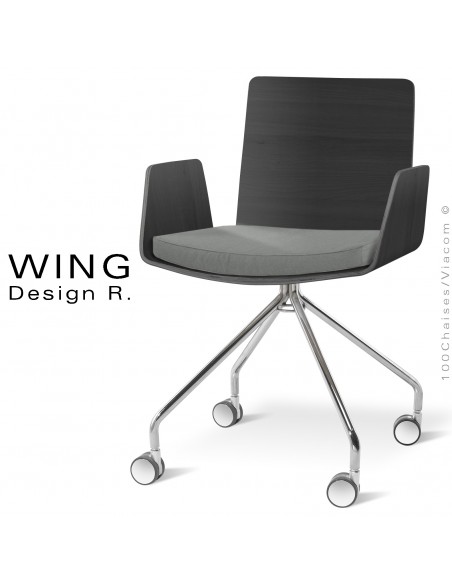 Fauteuil design à roulettes WING, piétement quatre branches en tube d'acier  Ø19 mm., avec roulettes. Finition peinture polyester au choix ou chromé brillant. Assise fixe coque en multiplis de bois, cintré à la vapeur, épaisseur 10 mm., finition assise placage bois de hêtre vernis ou placage zébrano deux faces. sur les deux faces. Option coussin, garnis de mousse polyuréthane, épaisseur 40 mm., habillage tissu gamme "Montagu" du fabricant PANAZ, composition 100% Acrylique, ignifugé M2 pour la France ou EN 1021 1&2. Couleur coussin en standard Grey/Stone-583, autre sur demande.