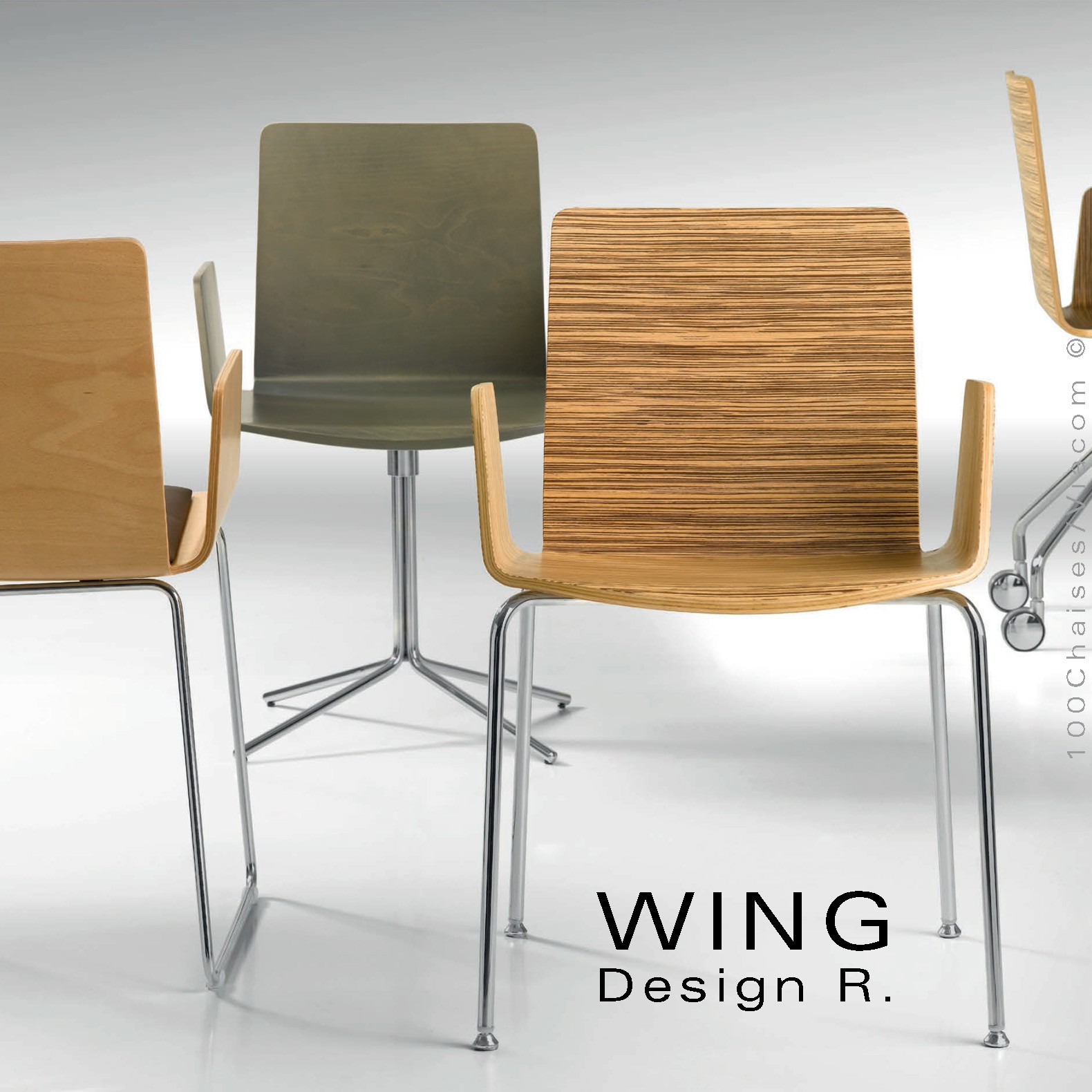 Fauteuil design à roulettes WING, piétement quatre branches en tube d'acier  Ø19 mm., avec roulettes. Finition peinture polyester au choix ou chromé brillant. Assise fixe coque en multiplis de bois, cintré à la vapeur, épaisseur 10 mm., finition assise placage bois de hêtre vernis ou placage zébrano deux faces. sur les deux faces. Option coussin, garnis de mousse polyuréthane, épaisseur 40 mm., habillage tissu gamme "Montagu" du fabricant PANAZ, composition 100% Acrylique, ignifugé M2 pour la France ou EN 1021 1&2. Couleur coussin en standard Grey/Stone-583, autre sur demande.