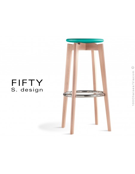 Normes européennesTabouret design bois FIFTY/UP structure 4 pieds en bois de hêtre massif, finition vernis naturel ou peint (sur demande) avec repose-pieds acier chromé brillant ou peint dans la couleur de l'assise (sur demande). Assise en bois de hêtre massif Ø32 cm., peinture polyester finition couleurs : blanc cassé, orange, bleu, ou vert (d'autre couleur possible dans la gamme RAL sur demande). Hauteur d'assise : 78 cm. Avec tampons plastiques de protection des sols.