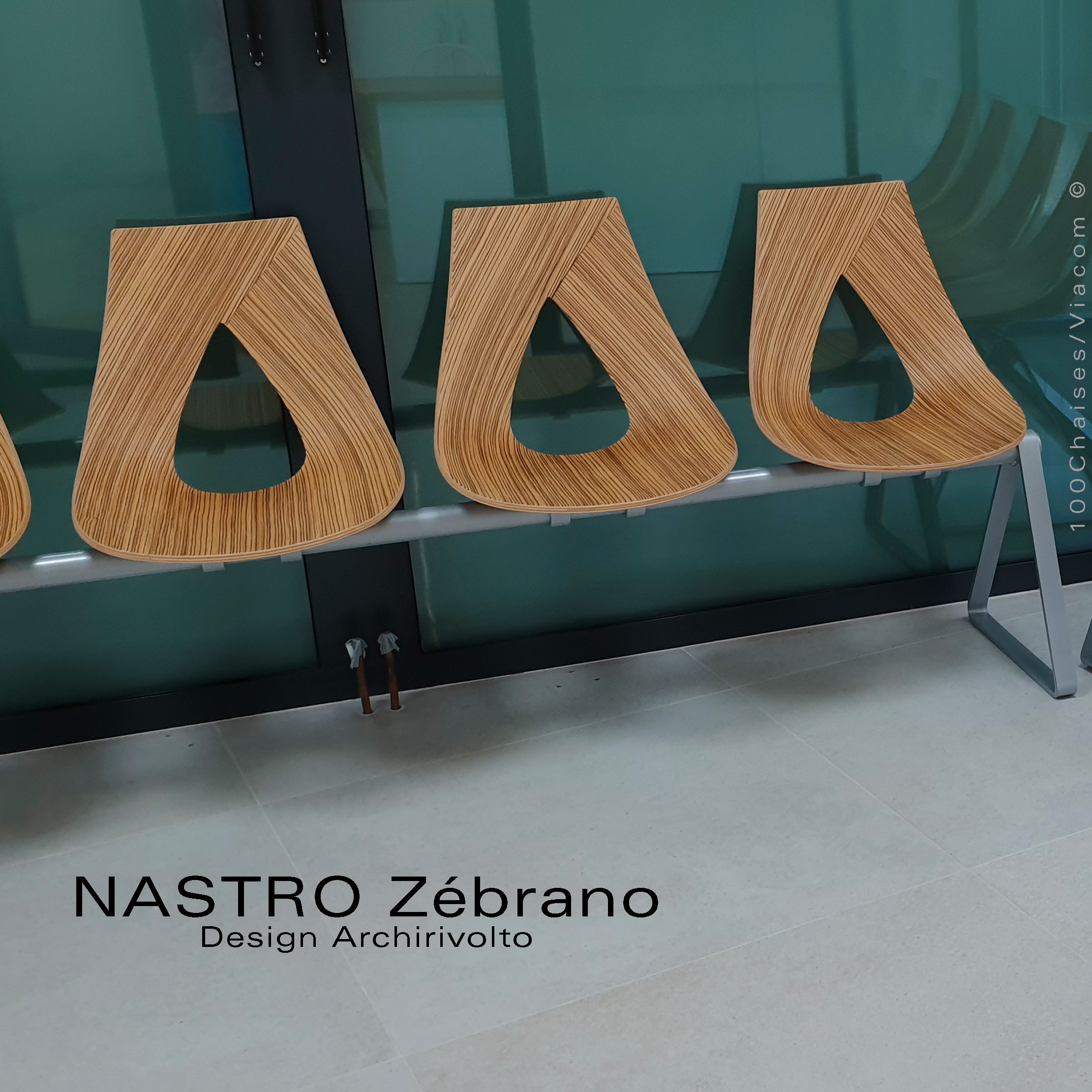 Normes européennesBanc design ou siège sur poutre pour salle d'attente NASTRO-C4M, avec tablette porte revue. Assise 4 places en multiplis de bois hêtre cintré à la vapeur, épaisseur 10 mm., finition plaquage bois naturel Zébrano deux faces. Possibilité d'intervertir au montage les assises et la tablette suivant votre choix. Piétement triangle d'acier 40x10 mm., structure ou poutre de soutien en tube Ø50 mm., finition peinture polyester suivant gamme fabricant ou autre dans la gamme RAL. Avec tampons plastique de protections des sols. Tablette dimensions 500x500 mm., type Agglo. épaisseur 23 mm., finition placage stratifié noir, chant aluminium. Livré assise et tablette démonté (option possible sur demande coussin d'assise, cuir synthétique, tissu tissé, velours, feutre etc…) votre demande à commandes@100chaises.fr
