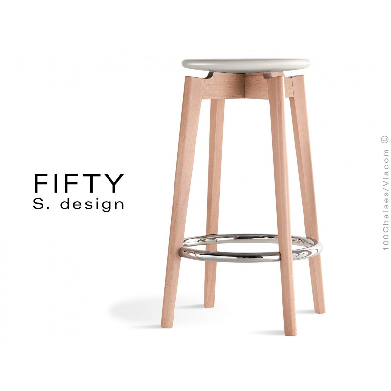 Tabouret FIFTY-65 assise couleur blanc cassé piétement bois naturel hauteur 65 cm
