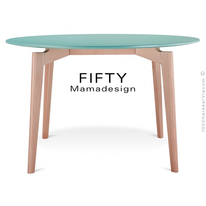 Normes européennesTable ronde en bois FIFTY, plateau type MDF Ø120 cm., épaisseur 20 mm., bord ou chant incliné 45°, finition peinture, couleur standard : blanc cassé, vert, bleu, orange (d'autre couleur possible sur demande). Piétement ou structure en bois de hêtre, vernis naturel incolore (autre sur commande voir palette). Avec tampons de protections des sols.
