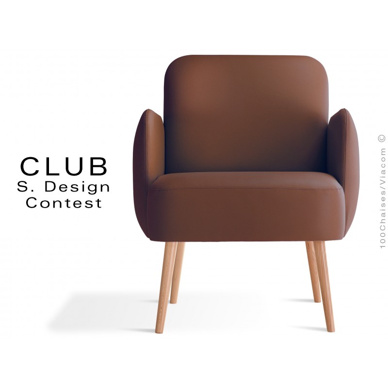Fauteuil esprit rétro CLUB, assise et dossier garnis de mousse, habillage cuir synthétique, piétement bois conique.