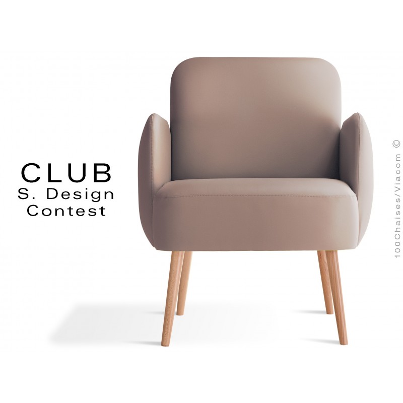 Normes européennesFauteuil CLUB, esprit rétro. Structure multiplis de bois de hêtre. Assise, dossier et accoudoirs garnis de mouse polyuréthane indéformable à densité variable. Revêtement aspect cuir synthétique gamme TIFFANY, composition 83% PVC, 17% PES ou autre type tissu. 4 pieds en bois massif de hêtre rond et légèrement conique, finition vernis incolore naturel (sur commande autre vernis ou peint couleur RAL). Avec tampons plastiques de protection des sols.