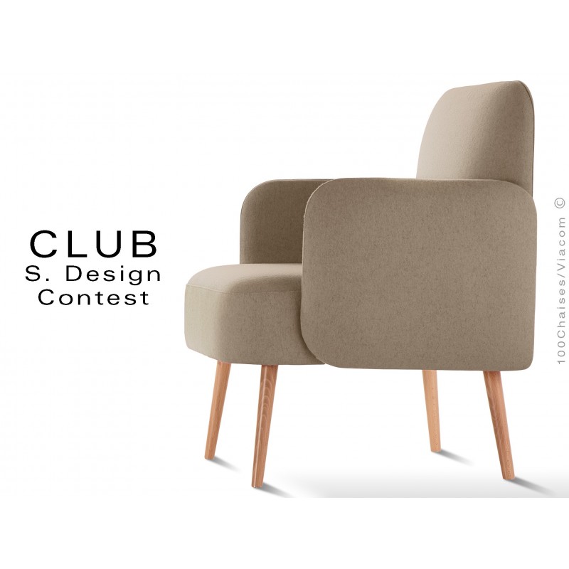 Normes européennesFauteuil CLUB, esprit rétro, assise, dossier et accoudoirs garnis de mousse polyuréthane indéformable à densité variable. Habillage tissu type feutre gamme WOOL, 100% laine naturel. Structure multiplis de bois de hêtre. Piétement 4 pieds rond légèrement conique en bois de hêtre massif, finition vernis incolore naturel (sur commande autre vernis ou peint couleur RAL). Avec tampons plastiques de protection des sols.