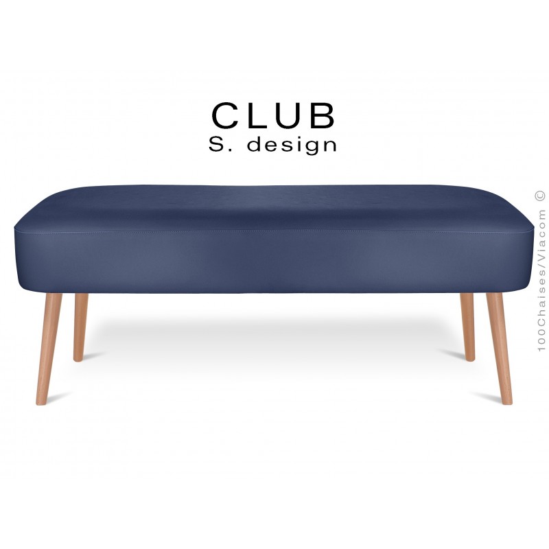 Petite banquette, banc ou repose-pieds rectangulaire CLUB, esprit rétro, assise garnie de mousse polyuréthane indéformable à densité variable. Revêtement tissu aspect cuir synthétique pour collectivités, gamme TIFFANY, composition 83% PVC, 17% PES. Structure multiplis en bois de hêtre, 4 pieds bois massif de hêtre rond et légèrement conique, finition vernis incolore naturel. Avec tampons plastiques de protection des sols (autres finitions tissus et piétements sur demande à commandes@100chaises.fr).