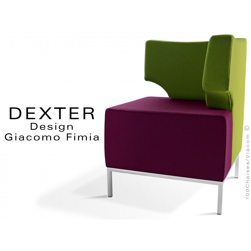 Banquette d'angle modulable 2 tons DEXTER, structure en bois recomposé multicouche, assise et dossier garnis de mousse polyuréthane indéformable avec densité différenciée. Habillage feutre 100% laine, tissu ou aspect cuir synthétique pour collectivités. Piétement en tube d'acier carré, finition chromé.