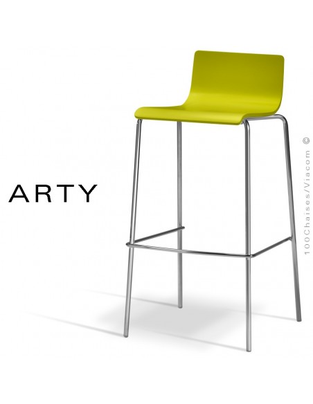 Tabouret de bar ARTY, pour bar, bistrot, café, hôtel, restaurant C.H.R., mais aussi pour les collectivités. Assise avec demi dossier pour un confort optimal. Structure assise coque multiplis de bois de hêtre, épaisseur 10 mm., cintré à la vapeur. Couleurs au choix suivant nuancier d'aspect satiné. Piétement 4 pieds en tube d'acier Ø16 mm., avec repose-pieds. Finition structure acier chromé brillant ou peinture au choix (voir palette fabricant), vos demandes à commandes@100chaises.fr - Lot de 4 pièces.