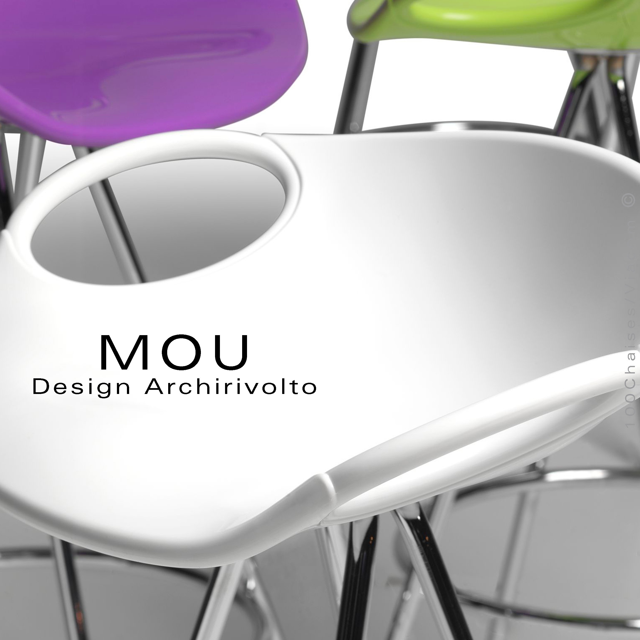 Normes européennesTabouret design MOU-65 pour cuisine ou îlot central, hauteur d'assise 65 cm. Assise coque plastique "Restylon", monobloc, teinté dans la masse. Couleurs : blanc, noir, vert, violet. Structure 4 pieds en tube d'acier Ø16 mm, avec repose-pieds et tampons plastiques de protection des sols. Finition peinture polyester argent-gris, gris foncé, noir ou acier chromé.