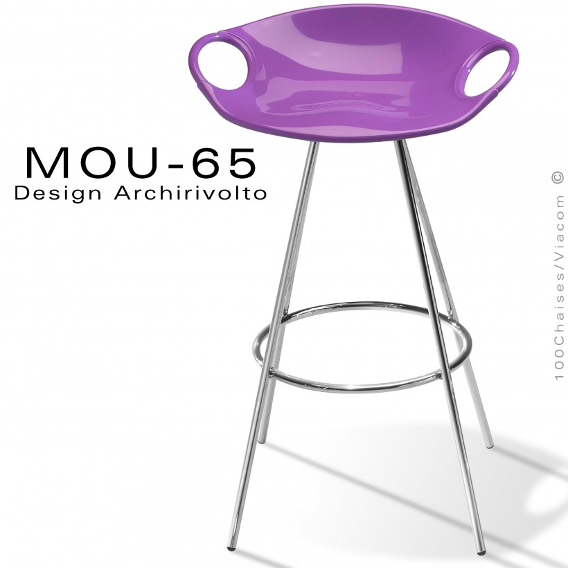Normes européennesTabouret design MOU-65 pour cuisine ou îlot central, hauteur d'assise 65 cm. Assise coque plastique "Restylon", monobloc, teinté dans la masse. Couleurs : blanc, noir, vert, violet. Structure 4 pieds en tube d'acier Ø16 mm, avec repose-pieds et tampons plastiques de protection des sols. Finition peinture polyester argent-gris, gris foncé, noir ou acier chromé.