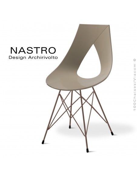 Chaise design NASTRO, piétement type Eiffel en fil d'acier peint ou chromé brillant, assise plastique couleur avec coussin cuir.