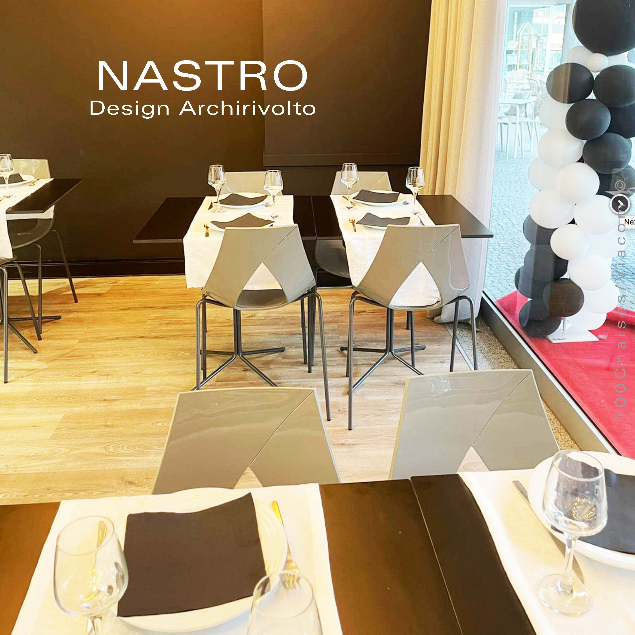 Chaise design NASTRO, assise coque plastique "Restylon", monobloc, teinté dans la masse de couleurs, violet, anthracite, noir, blanc, taupe et vert pomme. Option coussin d'assise aspect cuir synthétique, gamme Ginkgo du fabricant Griffine, composition 85% PVC, 15% coton. épaisseur 1,3 mm. Certification feu M1 (NFP 92503), AM 18 (NFD 60-013), EN 1021.1-2 . Couleur coussin en standard anthracite (autre sur demande voir gamme fabricant). Piétement type Eiffel en fil d'acier Ø11 mm. Finition piétement peinture polyester suivant gamme fabricant (voir palette) ou autre dans la gamme RAL, mais aussi chromé brillant. Avec bouchons plastiques de protections des sols - Lot de 2 pièces.