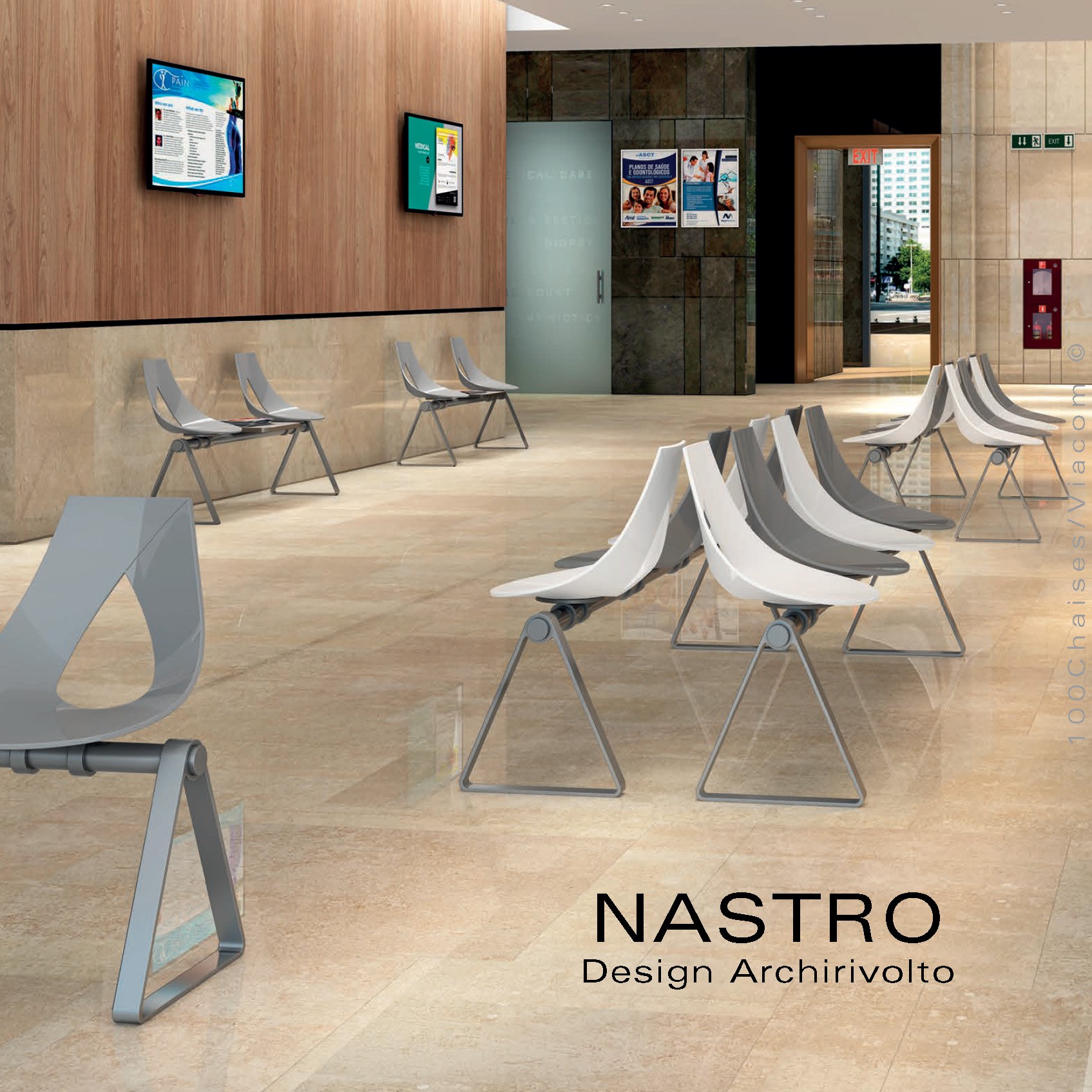 Assise sur poutre ou banc design gamme NASTRO ce distingue par son design et son originalité. Son style branché et contemporain attire l’œil, tout simplement. Une belle création qui fera parler d'elle ! Il prendra très facilement place dans toutes les ambiances en alliant modernisme et originalité. La gamme NASTRO, au design épuré et élégant vous offre une assise résistante et confortable en polypropylène monobloc. Elle se décline au gré de vos envies : banc ou siège sur poutre de 2 à 5 places disponible dans différents coloris, blanc, gris taupe, anthracite, noir, vert pomme et violet, posés sur une poutre de soutien et piétement en acier fer plat, déclinable dans les couleurs proposées par le fabricant ou personnalisé selon vos choix, gamme RAL. L'option tablette porte revue en aggloméré avec une finition placage stratifié deux faces avec un champ PVC couleur ou aluminium offre un plus. Cette gamme trouve naturellement sa place dans des les salles d'attente ou dans des espaces à fort passage.