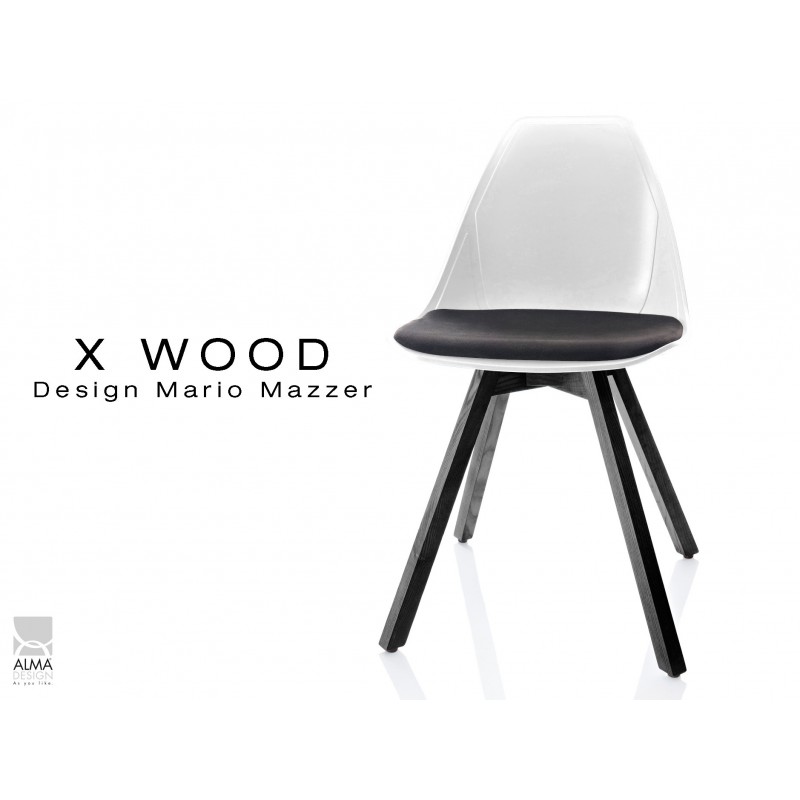 Normes européennesChaise design coque piétement bois X-WOOD assise avec coussin garnie de mousse polyuréthane. Habillage aspect cuir type skai (synthétique) de couleur noir. Piétement 4 pieds en bois de frêne, vernis gris fer avec tampons plastique de protection des sols. Convient essentiellement pour l'intérieur ou terrasse type véranda.