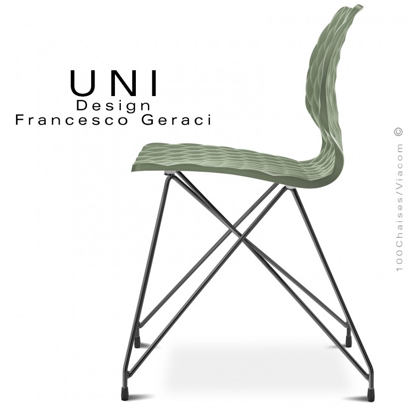 UNI, chaise design assise coque plastique, effet matelassé, monobloc, teinté dans la masse. Couleur assise disponible : anthracite - argile - blanche - bleu poudre - gris petit gris - gris Tourterelle - noir - vert Olive - vert Pistache - rouge Corail de couleur voir palette au choix. Piétement fantaisie type Eiffel en rond ou fil d'acier Ø10 mm., avec tampons plastique de protection des sols. Finition piétement peint ou chromé brillant. Convient essentiellement pour l'intérieur version piétement chromé, en extérieur piétement peint - Lot de 2 pièces.