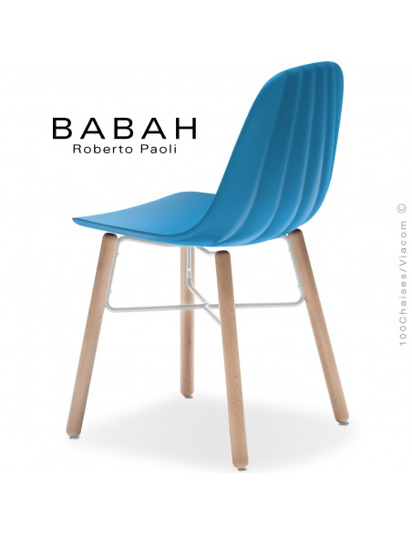 Chaise repas design BABAH, pieds bois massif de hêtre vernis, structure peint, assise coque plastique couleur, dossier nervuré.