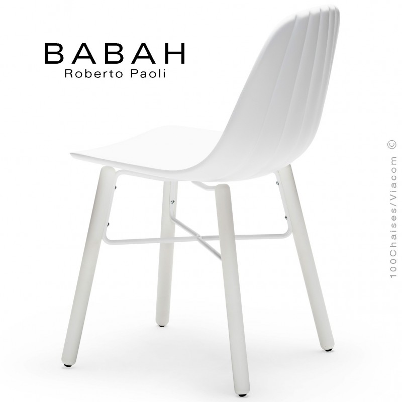 Chaise repas design BABAH, pour les professionnels, CHR et collectivités, mais aussi le particulier, salle à manger, cuisine, chambre. Assise coque plastique rigide en polyuréthane ignifugé, dossier nervuré donnant l'aspect d'un coquillage. Couleur assise monochrome ou bicolore au choix voir palette fabricant. Petite structure sous l'assise en tube d'acier peint noir ou blanc. Piétement 4 pieds en bois massif de hêtre rond Ø45 mm., finition vernis incolore ou peint noir, blanc avec tampons plastique de protection des sols. Vos demandes à : commandes@100chaises.fr