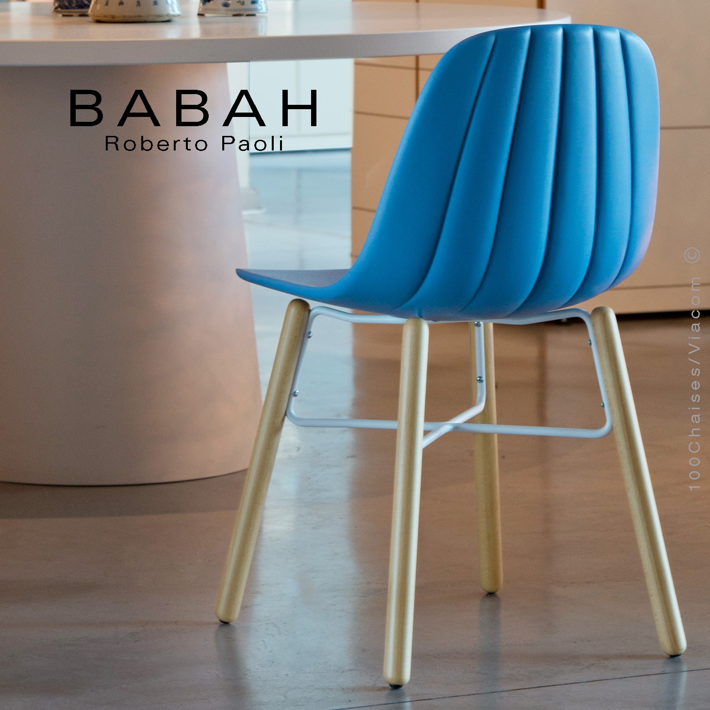 Chaise repas design BABAH, pieds bois massif de hêtre vernis, structure peint, assise coque plastique couleur, dossier nervuré.