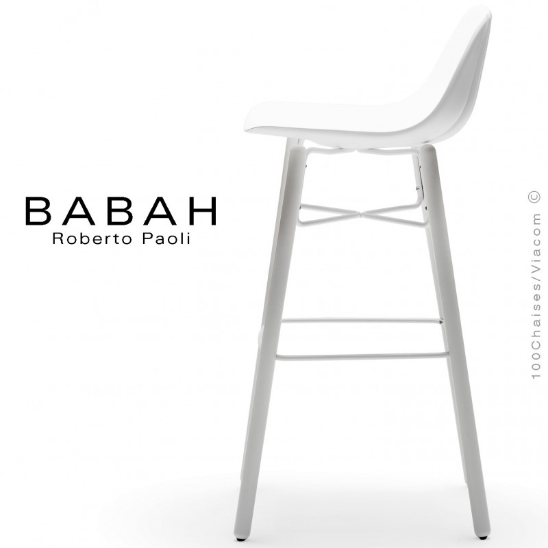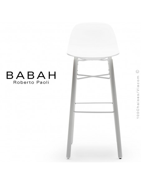 Tabouret de bar BABAH Wood W80, pieds bois blanc, structure acier blanc, assise plastique blanc.