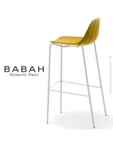 Tabouret de bar design BABAH-80, pour les hôtels, les cafés, les restaurants, CHR, collectivités mais aussi la maison, cuisine, îlot central. Assise coque plastique rigide en polyuréthane ignifugé avec demi-dossier en forme de coquillage ou nervuré. Couleur disponible bleu, blanche, jaune, noir. Piétement 4 pieds en tube d'acier Ø15 mm., avec reposes-pieds. Finition peinture noir ou blanche et chromé brillant. Avec des tampons plastiques de protections des sols.
