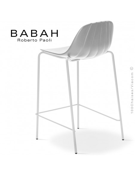 Tabouret de cuisine design BABAH-65, pour les hôtels, les cafés, les restaurants, CHR, mais aussi pour votre maison, cuisine, îlot central. Assise coque plastique rigide en polyuréthane ignifugé avec demi dossier en forme de coquillage ou nervuré. Couleur assise jaune, blanche, noir, bleu. Piétement 4 pieds en tube d'acier Ø15 mm., avec reposes-pieds, finition peinture noir, blanche ou chromé brillant. Avec tampons plastique de protection des sols.