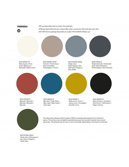 Nassau est une collection de chaise, fauteuil et tabouret, monobloc en polypropylène renforcé de fibre de verre et moulée par injection selon la technologie «Air Moulding», qui la rend robuste et légère en même temps. Les lignes arrondies, le design essentiel et les formes sinueuses distinguent son caractère. Le dossier ergonomique et la finition brillante sur l’arrière du dos s'insère dans un cadre imaginaire qui valorise son importance. L’assise qui s’accorde au dossier crée en outre une continuité esthétique. Disponible en 10 coloris (blanc, azur, gris souris, vert pelouse, tourterelle, ocre, marsala, moka, anthracite et noir), Nassau est conçue pour une utilisation à l’intérieur et à l’extérieur. Elle est empilable par 5 pièces pour faciliter la manipulation durant le stockage et les patins transparents sont également en polypropylène.