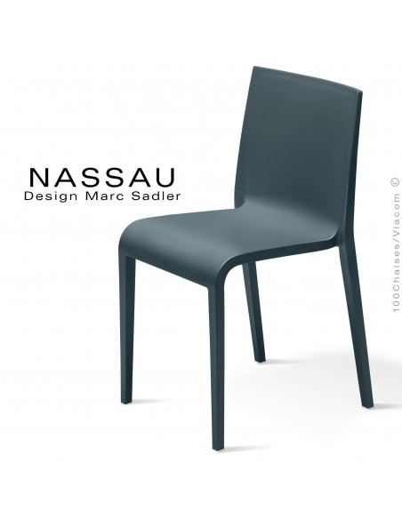 Chaise d'extérieur pour terrasse d'hôtel, restaurant ou jardin NASSAU structure monobloc en polypropylène (plastique), moulée par injection "Air Moulding". Piètement 4 pieds avec tampon plastique pour les sols, chaise empilable par 5 pièces. Couleur disponible : blanc pure, bleu Capri, gris-petit-gris, vert olive, gris tourterelle, rouge Marsala, jaune curry, anthracite ou noir. Mobilier empilable, option disponible chariot de manutention sur roulettes.