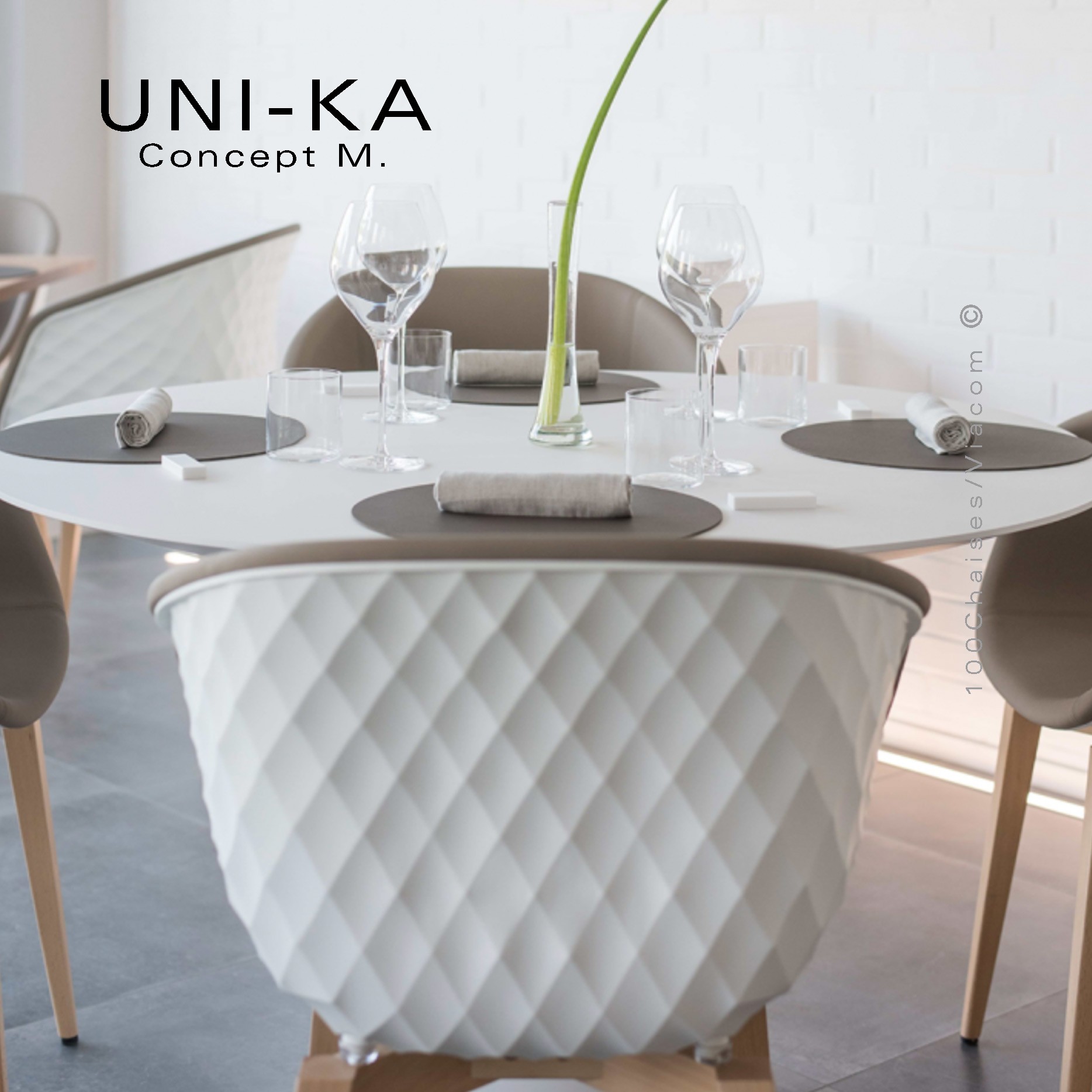 Uni-Ka ajoute une nouvelle dimension au monde des chaises coques grâce à son dessin matelassé. C'est un produit qui ne laisse pas indifférent avec sa forme arrondie et confortable ; un siège passe-partout, parce que le choix de couleurs de la coque en polypropylène et les différentes solutions du châssis en acier, la rendent idéale pour les collectivités, notamment pour les restaurants et hospitalité. Le fauteuil Uni-Ka est disponible dans de nombreuses finitions, tant au niveau des coques que des piètements, lui permettant de s'adapter à des ambiances élégantes, ou ludiques selon les coloris.
