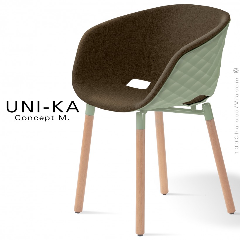 Fauteuil design chic et tendance UNI-KA, assise coque plastique couleur polypropylène effet matelassé, couleur au choix voir palette fabricant. Assise garnie de mousse polyuréthane, habillage tissu tissé gamme Medley du fabricant Gabriel, 100% polyester. Ignifugé : EN 1021 1&2 Cigarette and Match - EN 1021-1 Cigarette. Couleur tissu corde ou marron à la vente autre couleur au choix suivant gamme Fabricant (voir palette). Piètement 4 pieds, en bois de hêtre massif cylindrique Ø35 mm., vernis gris, châtaignier, brun, miel, noir ou peint sur demande. Avec tampons plastiques de protection des sols - Vos demandes à commandes@100chaises.fr
