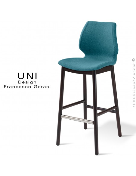 Normes européennesTabouret de bar design UNI, assise coque plastique effet matelassé en polypropylène, monobloc, teinté dans la masse. Couleurs dossier arrière disponibles : anthracite - argile - blanche - bleu poudre - gris petit gris - gris Tourterelle - noir - vert Olive - vert Pistache - rouge Corail de couleur voir palette. Structure et piétement 4 pieds en bois de hêtre de section ronde Ø45 mm., avec repose-pieds inox. Finition piétement teinté noir, teinté châtaigne, teinté brun, teinté miel, teinté gris ou peint sur demande. Convient essentiellement pour l'intérieur. Avec tampons plastiques de protections des sols.