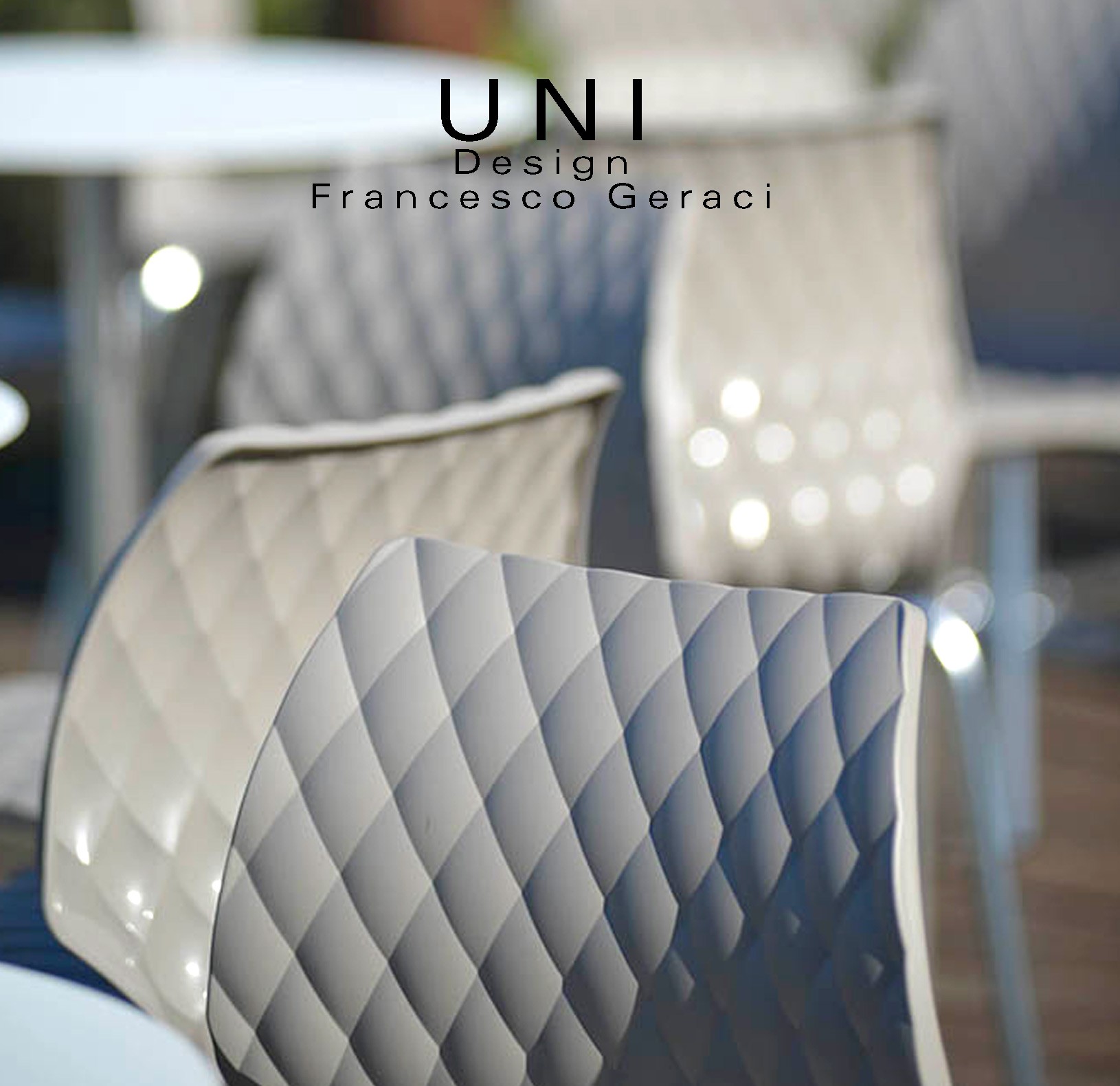 Tabouret de bar confort design UNI, assise et dossier coque plastique effet matelassé en polypropylène, monobloc, teinté dans la masse, d'aspect brillante pour le dos. Couleurs disponibles : anthracite - argile - blanche - bleu poudre - gris petit gris - gris Tourterelle - noir - vert Olive - vert Pistache - rouge Corail de couleur voir palette. Piétement type luge en rond ou fil d'acier Ø12 mm., avec repose-pieds. Finition peint ou chromé brillant. Convient pour l'intérieur version chromé, en extérieur version peinte. Avec tampons plastiques de protections des sols.