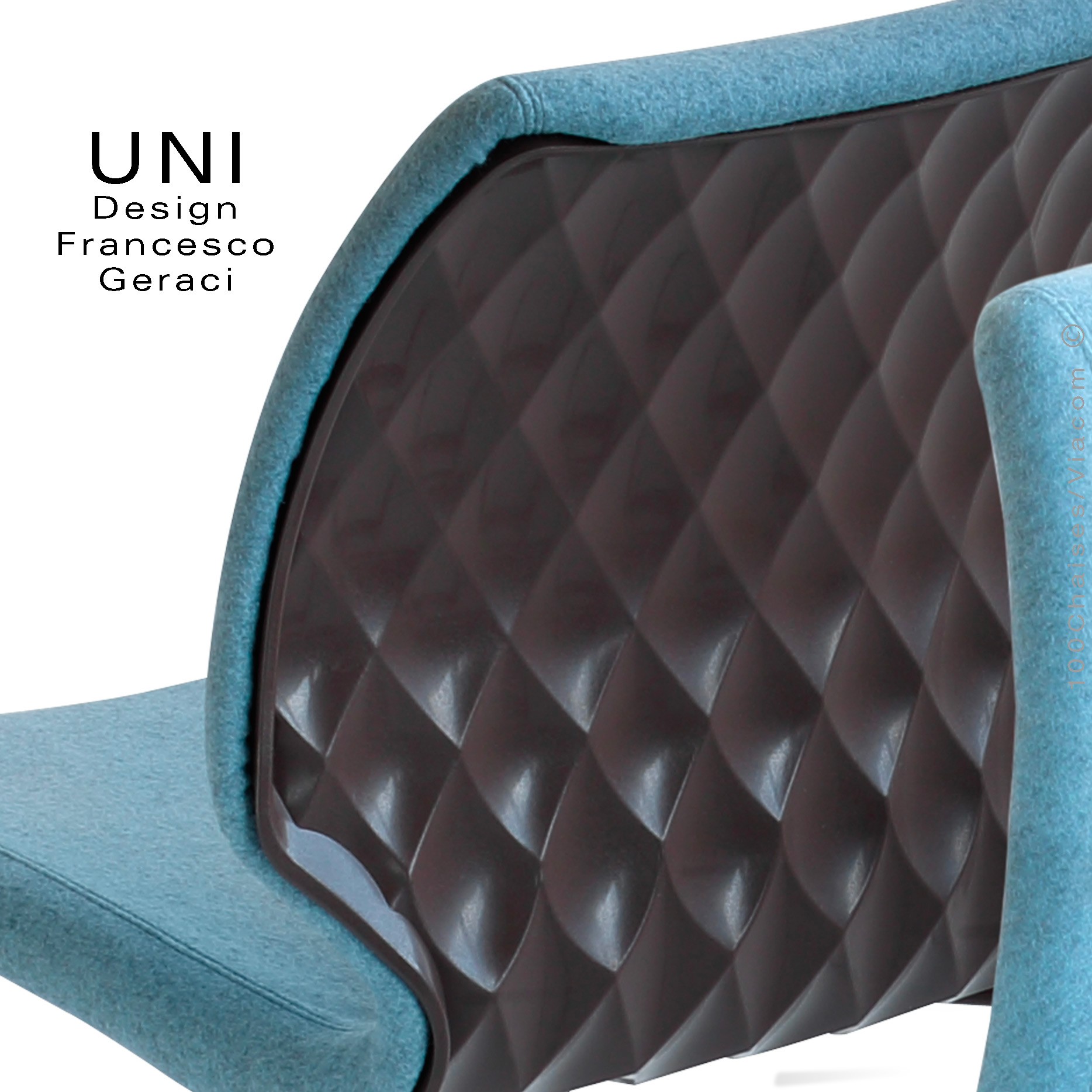 Tabouret de bar design UNI, assise et dossier coque plastique effet matelassé en polypropylène, monobloc, teinté dans la masse. Couleurs disponibles : anthracite - argile - blanche - bleu poudre - gris petit gris - gris Tourterelle - noir - vert Olive - vert Pistache - rouge Corail de couleur voir palette. Assise et dossier habillage tissu tissé, gamme Medley du fabricant Gabriel, composition 100% PL., ignifugé - BS EN 1021 1&2 Cigarette and Match. Couleur tissu au choix voir palette fabricant. Structure et piétement 4 pieds en bois de hêtre de section carré, légèrement conique avec repose-pieds inox. Finition piétement teinté noir, teinté châtaigne, teinté brun, teinté miel, teinté gris ou peint sur demande. Convient essentiellement pour l'intérieur. Avec tampons plastiques de protections des sols (vos demandes spécifiques à commandes@100chaises.fr).