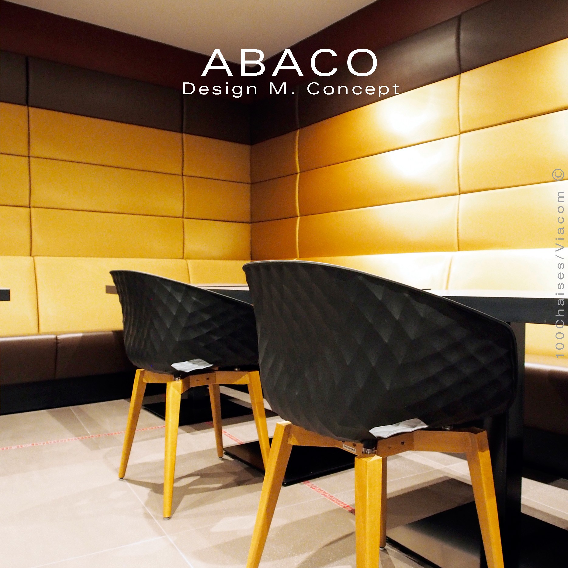 Liberté de composition… ABACO est le système de banquette modulable : la collection comporte, poufs, banquettes droites et d'angle, courbes concave et convexe ainsi que les modules de revêtements muraux, sont les éléments d'un produit au service de la conception et de la créativité. Les modules linéaires d’angle et les panneaux muraux rembourrés sont un système flexible et modulable qui, grâce aux différentes tailles disponibles, vous permettent de configurer et de décorer tout espace. La possibilité de combiner 3 couleurs de revêtement pour la base, l’assise et le dossier ainsi que celle des panneaux muraux permet de jouer sur des effets chromatiques importants qui vous permettent d'harmoniser avec l'environnement et le projet.