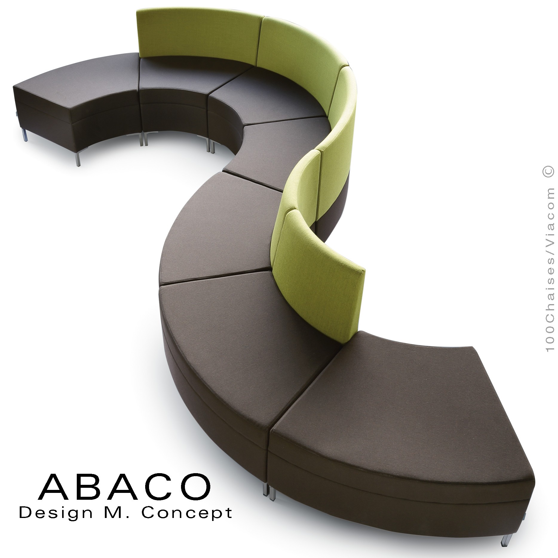 Normes européennesBanquette modulable courbe convexe ABACO assise et dossier garnis de mousse polyuréthane à haute résilience afin d'éviter tout risque d'affaissement. Habillage caisson et coussin d'assise tissu gamme FENICE 70% laine, 25% P.A., de couleur marron foncé (autre sur demande suivant palette couleur, voir palette tissu tissé, feutre, velours, cuir synthétique, cuir naturel). Châssis, structure tube d'acier et ossature bois. Piètement 4 pieds carrés tube d'acier 25x25 mm., aspect angle droit ou équerre à 90°, finition chromé brillant - Vos demandes à : commandes@100chaises.fr