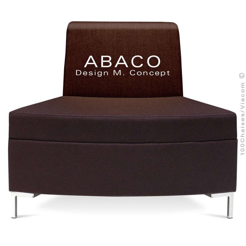 Banquette modulable courbe convexe ABACO assise et dossier garnis de mousse polyuréthane à haute résilience afin d'éviter tout risque d'affaissement. Habillage caisson et coussin d'assise tissu gamme FENICE 70% laine, 25% P.A., de couleur marron foncé (autre sur demande suivant palette couleur, voir palette tissu tissé, feutre, velours, cuir synthétique, cuir naturel). Châssis, structure tube d'acier et ossature bois. Piètement 4 pieds carrés tube d'acier 25x25 mm., aspect angle droit ou équerre à 90°, finition chromé brillant - Vos demandes à : commandes@100chaises.fr
