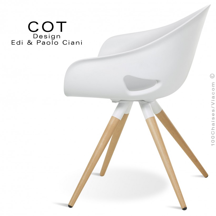 Fauteuil design COT, assise coque plastique en polypropylène, monobloc, teinté dans la masse, finition assise couleur deux tons : blanc/noir - blanc/violet - blanc/rouge - noir/noir - noir/blanc au choix. Piétement 4 pieds en bois de hêtre massif légèrement conique Ø35 mm., finition vernis incolore satiné, vernis blanchi, vernis wengé. Avec tampons plastiques noir de protections des sols.
