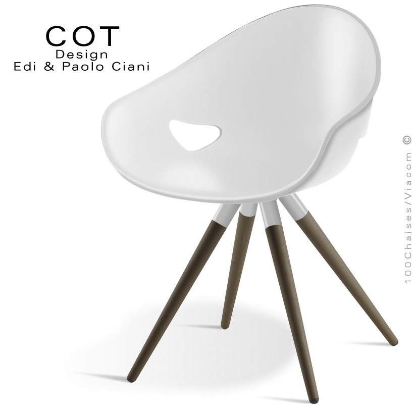 Normes européennesFauteuil design COT, assise coque plastique en polypropylène, monobloc, teinté dans la masse, finition assise couleur deux tons : blanc/noir - blanc/violet - blanc/rouge - noir/noir - noir/blanc au choix. Piétement 4 pieds en bois de hêtre massif légèrement conique Ø35 mm., finition vernis incolore satiné, vernis blanchi, vernis wengé. Avec tampons plastiques noir de protections des sols.