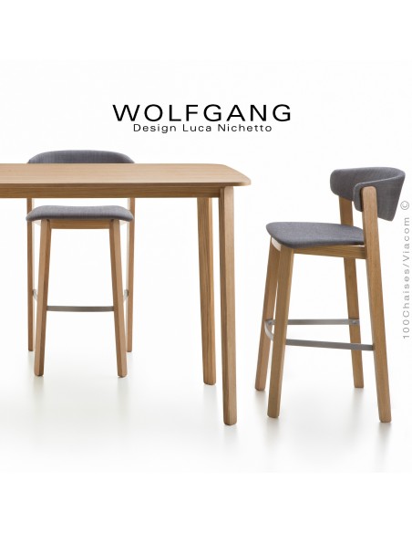 Tabouret design en bois de chêne WOLFGANG, pour cuisine et îlot central, assise et dossier garnis, habillage tissu.