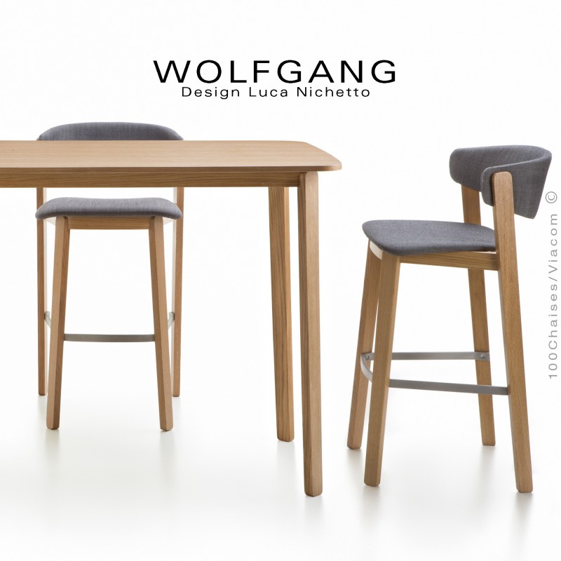Normes européennesTabourets design en bois WOLFGANG pour cuisine et îlot central, structure en bois de chêne massif, vernis noyer moyen. Assise et dossier en contre-collé incurvé, garnis de mousse polyuréthane, habillage tissu King-L-Kat du fabricant FIDIVI, classement feu M1. Avec repose-pieds en acier, finition chromé. Une référence explicite à la conception scandinave.