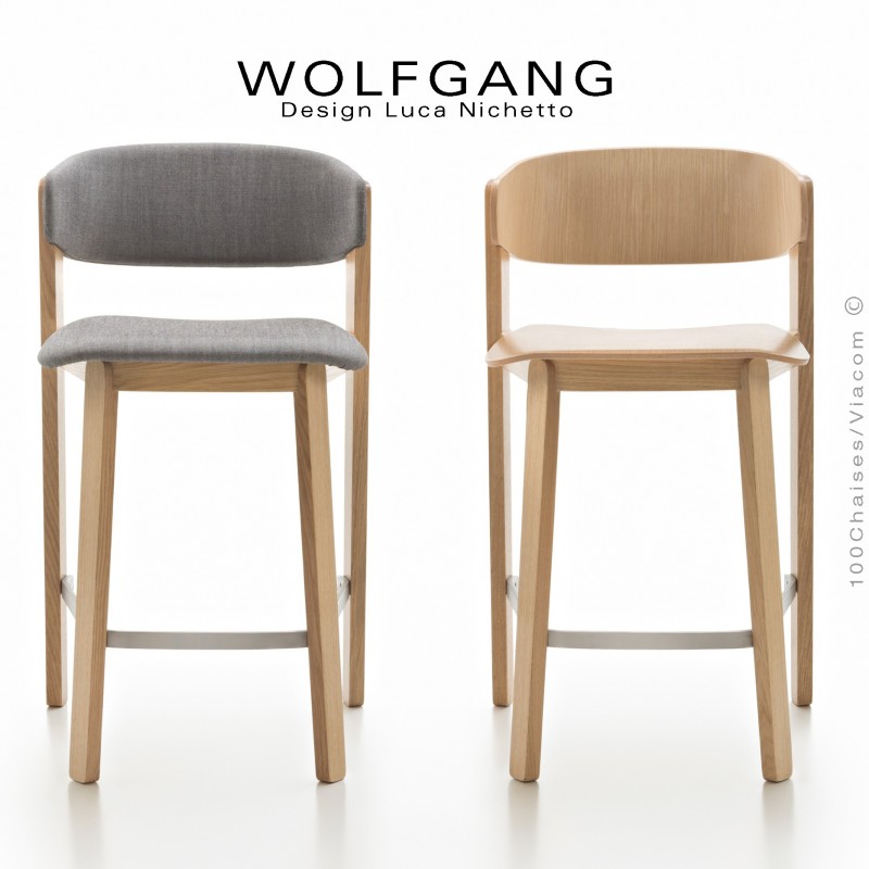 Tabouret design en bois de chêne WOLFGANG, pour cuisine et îlot central, assise et dossier garnis, habillage tissu.