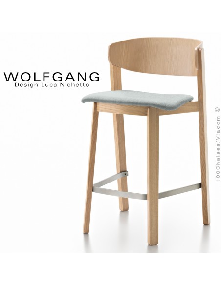 Normes européennesTabourets design en bois WOLFGANG pour cuisine et îlot central, structure en bois de chêne massif, vernis chêne clair. Assise et dossier en contre-collé de chêne incurvé, assise garnis de mousse polyuréthane, habillage tissu King-L-Kat du fabricant FIDIVI, classement feu M1. Avec repose-pieds en acier, finition chromé. Une référence explicite à la conception scandinave.