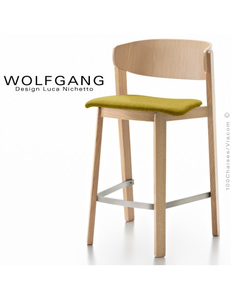 Tabouret en bois design WOLFGANG, piétement chêne clair, dossier chêne, assise habillage tissu couleur moutarde.