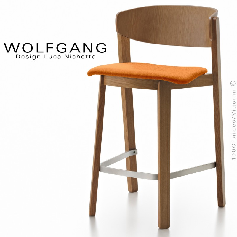 Tabouret design en bois WOLFGANG, pour cuisine et îlot central, vernis noyer, assise habillage tissu couleur orange.